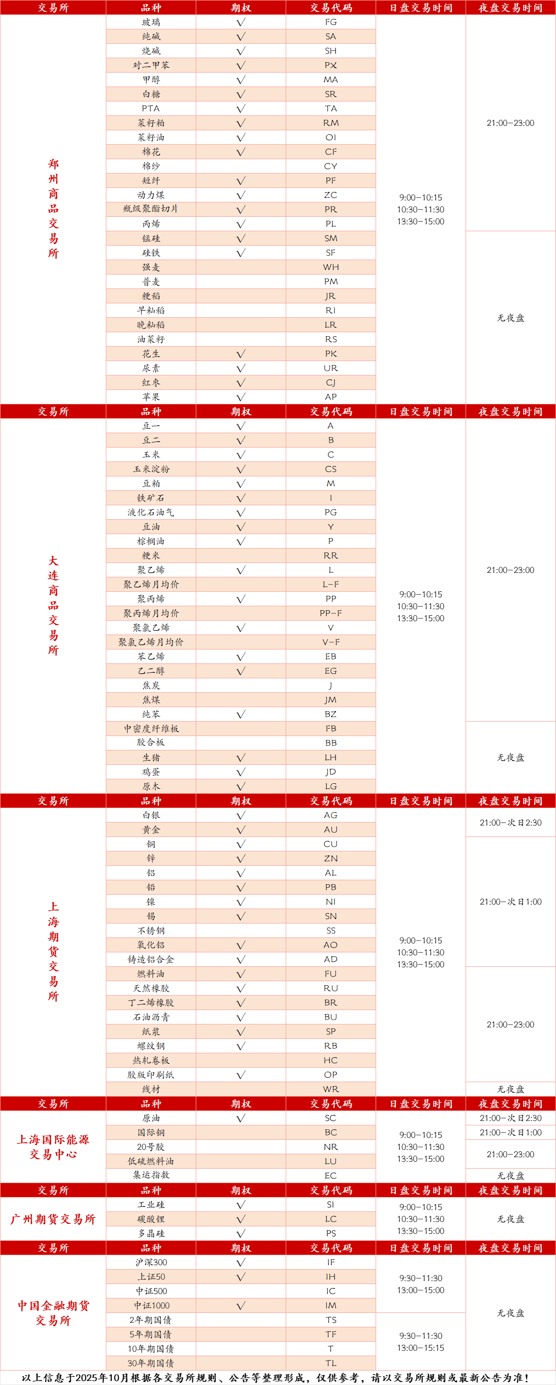 各期货、期权品种交易时间