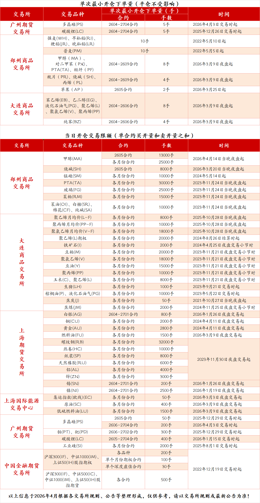 各交易所单次最小开仓量、当日开仓交易限额统计