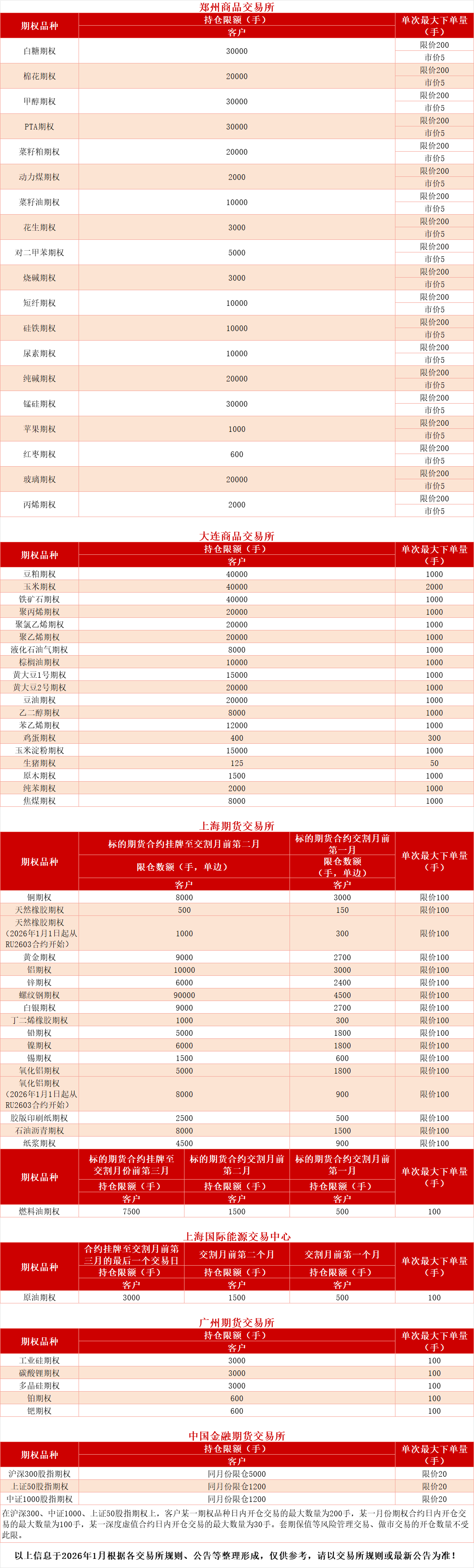 各交易所期权合约持仓限额